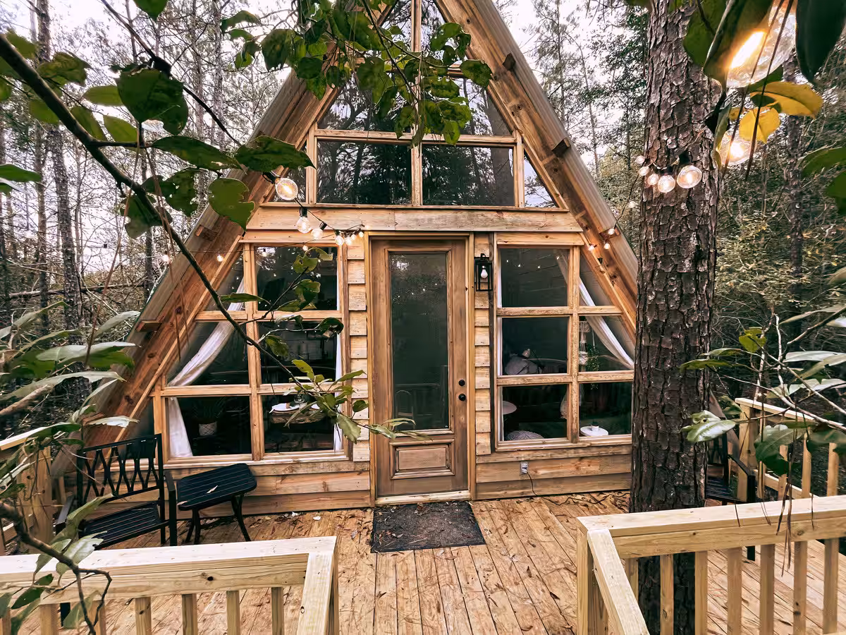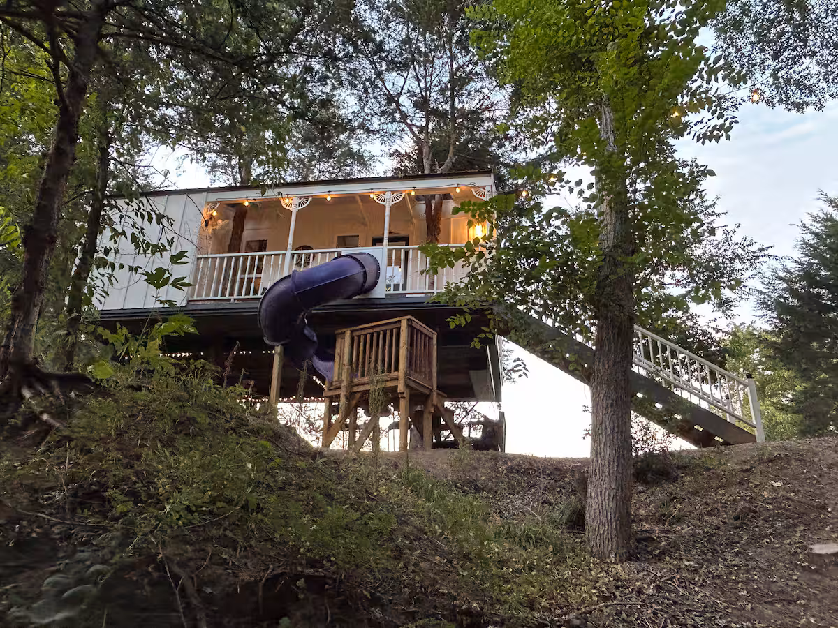 If you have kids who are dying for a treehouse escape (it’s only natural), look no further. Yellowstone Treehouse comes with a winding slide that you can take from the porch back down to earth. Just know that this is more like a mobile home on stilts. Regardless, you’ll be located high in the canopy, giving you that immersive treehouse feel.
