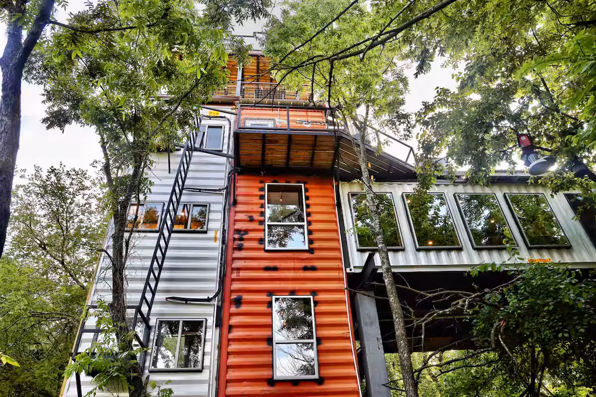 Full disclosure: this isn’t a treehouse. It’s a mashup of four shipping containers that has a whopping sixth floor (fit with a crow’s nest lookout) and five balconies. And its rooms look like they’re straight from a city center.