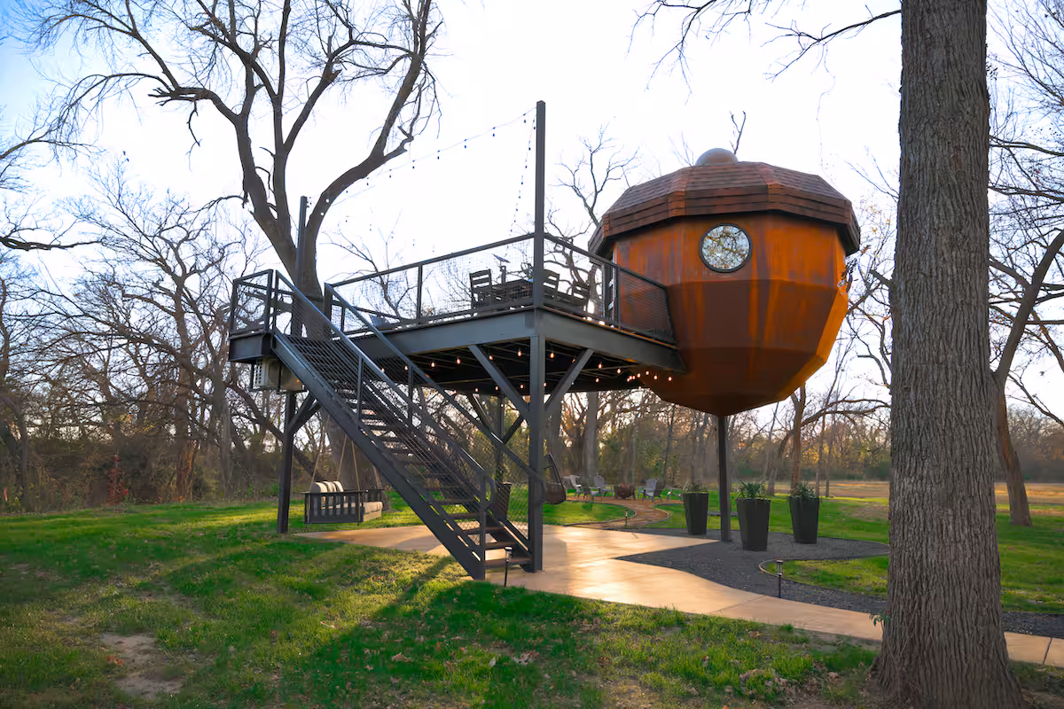From the outside looking in, this acorn-shaped treehouse looks like something from a carnival. It’s kitschy and attention-grabbing where it sits in a sparse woodland. But on the inside, it’s like something from a designer digest magazine.