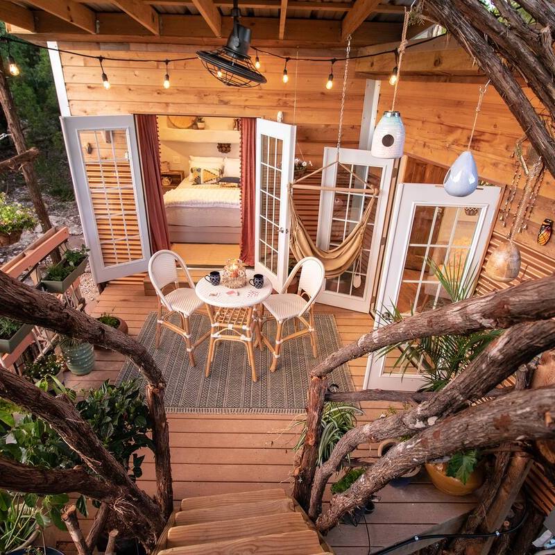 Like a jewel in the Texas Hill Country crown, The Nest is a tiny-home getaway nestled in the canopy. The interior has modern amenities and an adorable design that makes the space feel large and bright. Plus, the patio is expansive and even includes a mesh, in-laid bed. Best of all, this cozy treehouse-esque tiny home comes with great hosts who are ready and willing to help you customize a special visit.