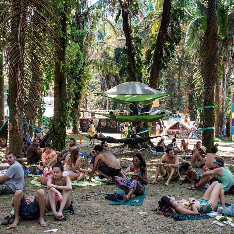 After a short bus ride, we arrived at the festival grounds. The area was beautiful and surrounded by lush forest. There were multiple lounges where we could hang out, chat with others, grab a bite to eat and drink, and sleep through the hottest portions of the day. These were framed by small stages where the music never let up, apart from a few midday hours.