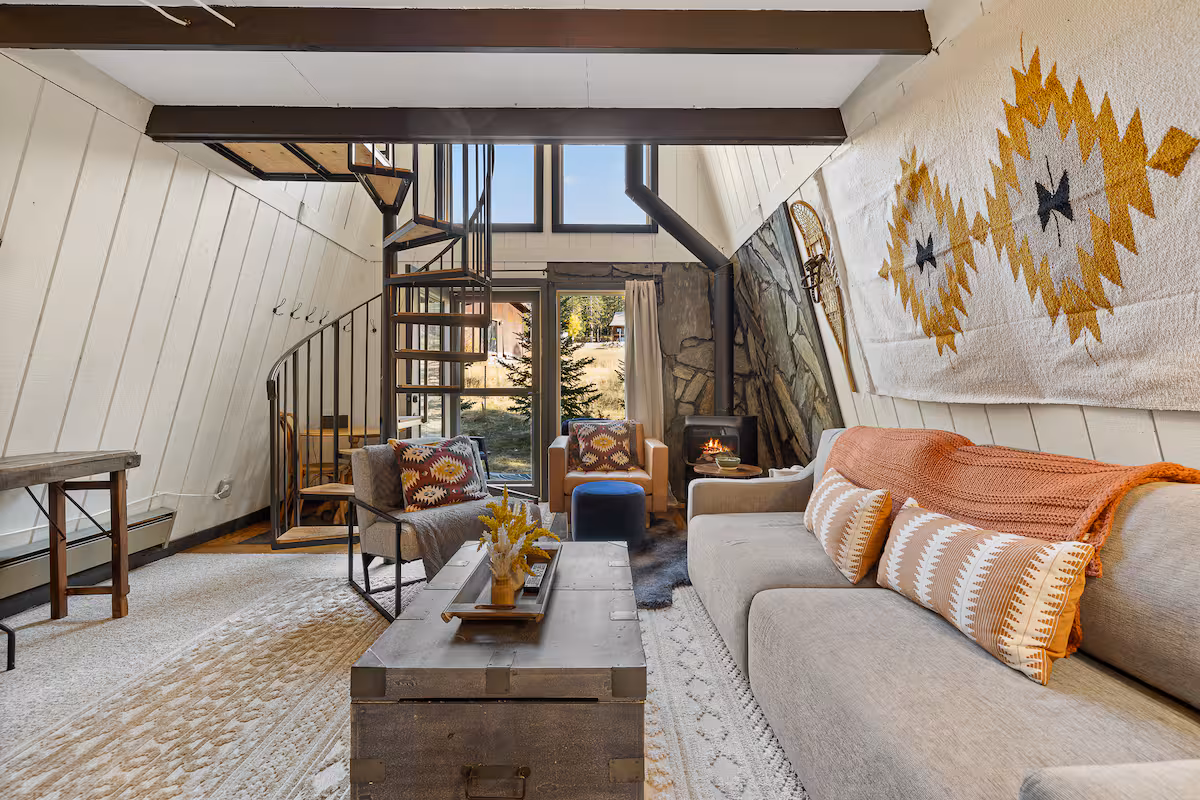 This A-Frame is nestled in the woods near a main road in the Black Hills, giving you both privacy and access. Nearby, you’ll find popular trails like the Mickelson Trail, along with hotspots like the famous Deadwood. The interior is bright and cozy, while there’s a great little porch out back with a full-sized hot tub. You can strike out on an adventure or just stay in. The choice is yours at this mountain cabin.
