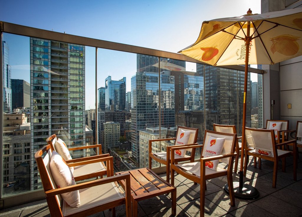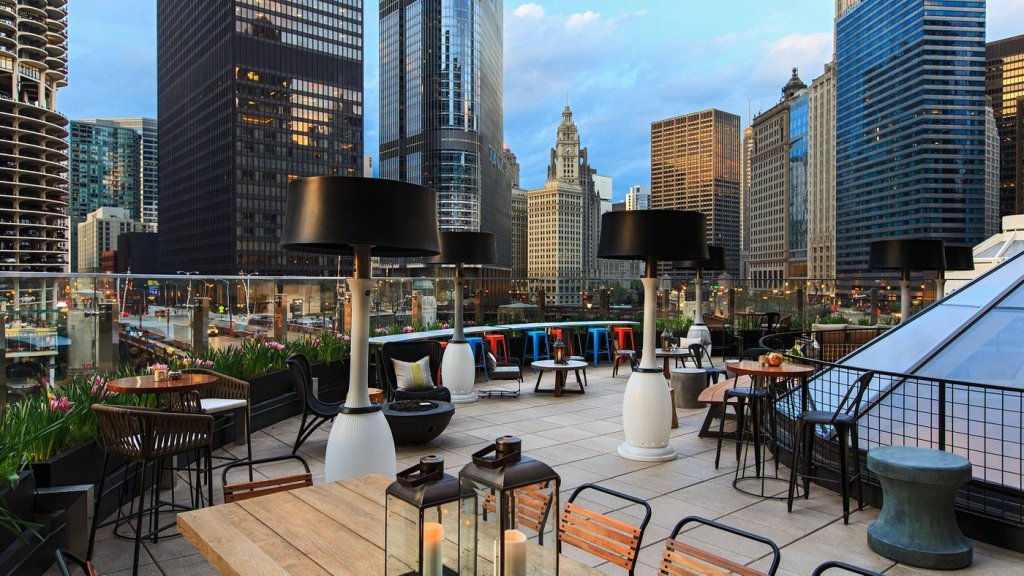 This Art Deco-themed rooftop takes you straight to the heart of Chicago’s architectural scene. Expect an upscale cocktail menu, along with a seasonal lunch and dinner menu. As an added perk, you can enjoy the winter-ready patio even after the warm weather ends.