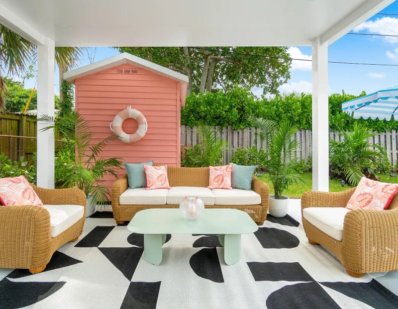 Speaking of private pools, this luxury pick gives you the keys to an effortlessly trendy stay. Think: Ultra-Instagramable Miami vibes. There are multiple outdoor seating areas, including a large bar, and an expansive living room where a crew of ten can hang out.