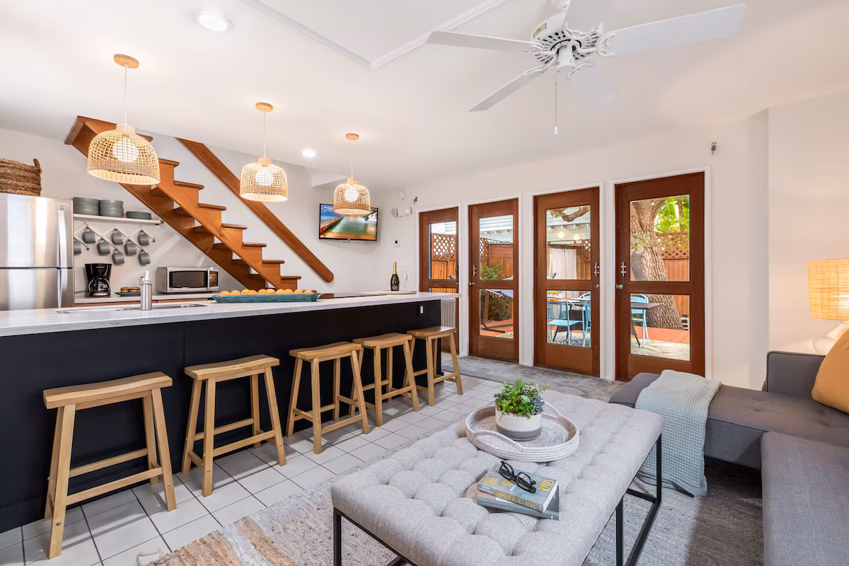 If you want a more Duval-forward (Duval Street is where all the partying and fun happens in Key West) rental, check out this one-bedroom rental that sleeps up to four. You’ve got a full backyard to hang out in, along with a renovated home that is decked out in modern beachy décor.