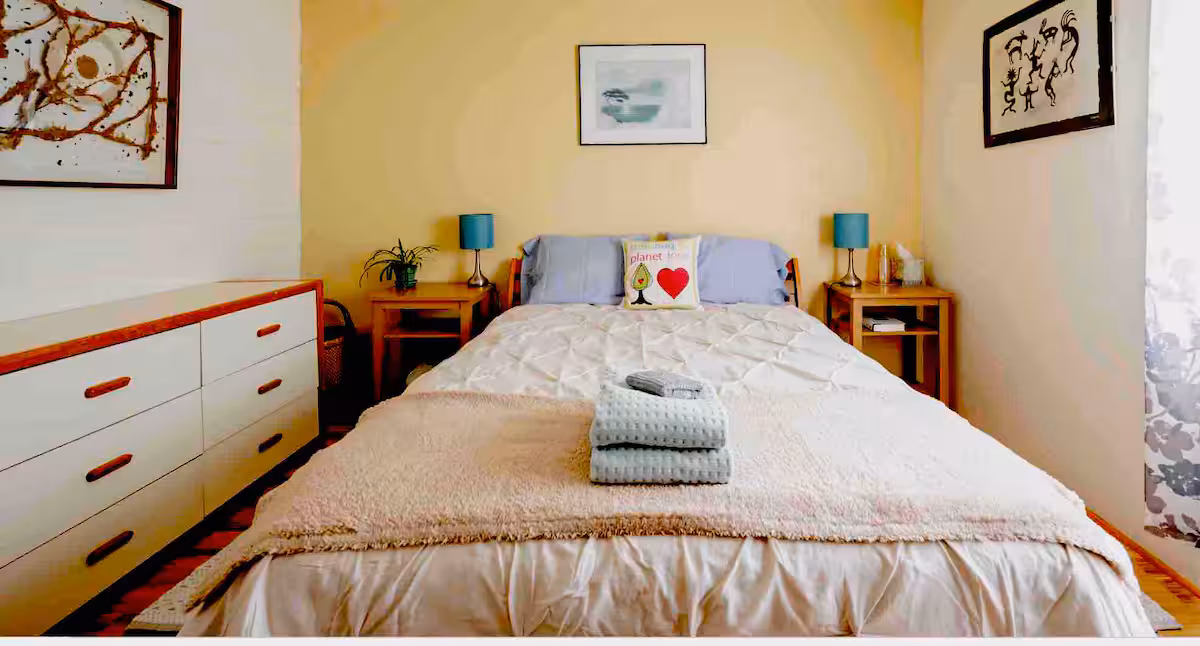 This lovely home has a bedroom for rent on Airbnb. It’s billed as a wellness retreat stay, which fits the bill. The host is even willing to take you to the grocery store upon arrival. The space is airy and light, while the bedroom has everything you could need for a comfortable stay—including an ensuite bathroom. Just know that this is only open to solo travelers.