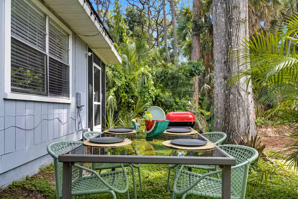 This three-bedroom home has a classic Floridian feel, blending beach cottage vibes with midcentury modern elements. You can comfortably sleep six guests thanks to this spacious setup, including a room with two twin beds. The exotic factor comes into play in the backyard. There’s a wonderfully manicured backyard that has a dining table. It’s very well maintained, meaning this isn’t the ‘wildest’ Airbnb in Sarasota when it comes to exotic greenery.