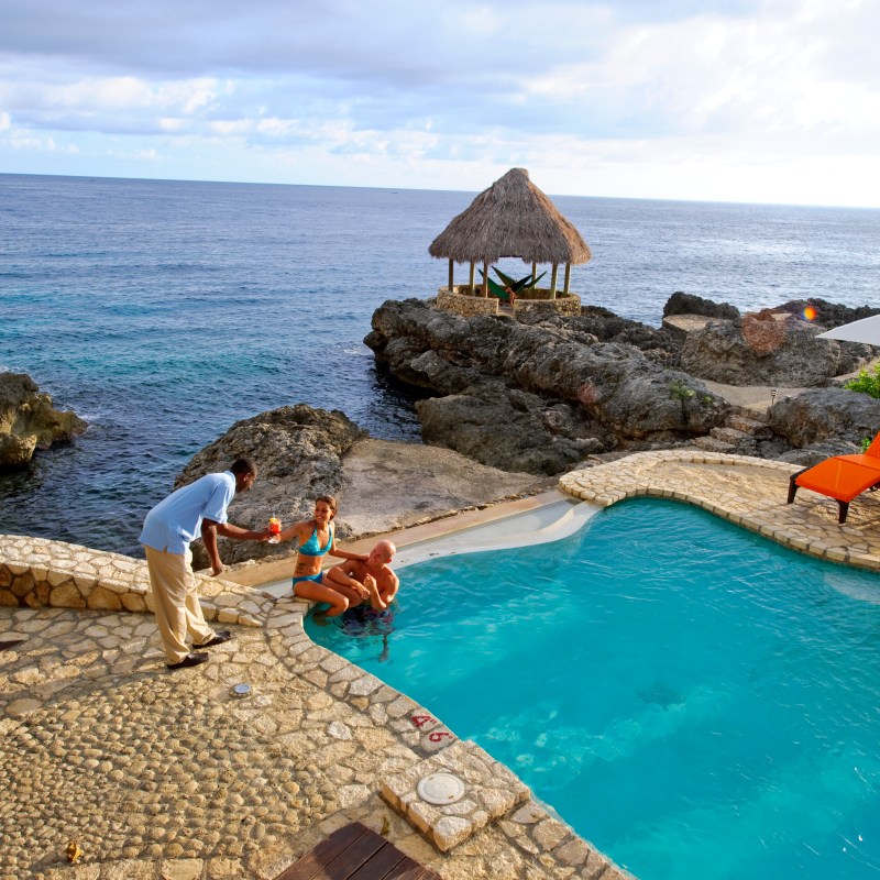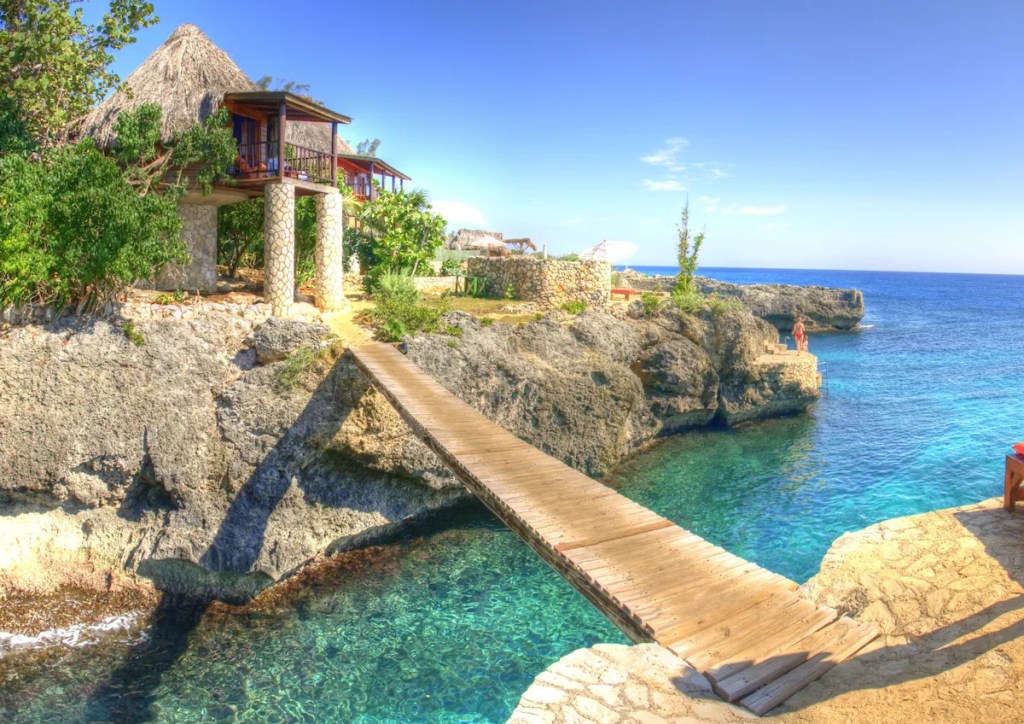 - Coolest features and amenities: Rocky coves for swimming, panoramic views from Negril’s rugged cliffs, fine dining meals, colonial architecture and design, and unique sundecks that are connected by footbridges