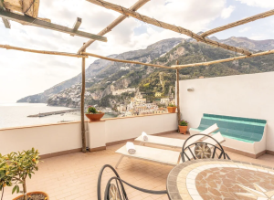 The house itself has a large terrace with a clear view of Positano’s churches and beaches. The high-ceilinged living room has a sofa that can also serve as a double bed.