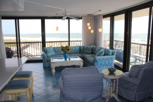 This condo promises an affordable vacation for a large group of travelers. It is a part of Sea Colony, a resort billed as “the premier family, beach, and tennis community.” This gives guests access to 12 pools, a sauna, a fitness center, and, of course, excellent tennis facilities. The condo is appropriately decorated according to a blue theme. More than just fresh air, those who venture out onto the wrap-around balcony are rewarded with unobstructed views of the beach and ocean. There is a master bedroom, a queen, and a children’s room with two full/twin bunk beds.