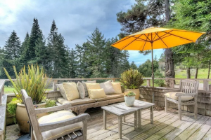 Located just south of downtown Seaside, this four-bedroom waterfront vacation home is dog-friendly for a nightly fee. Take in panoramic coastal views from the living room, main bedroom, and deck. This home boasts two stone fireplaces — one inside and one outside. Seaside Cove Beach is only steps away from this fabulous family-friendly rental.