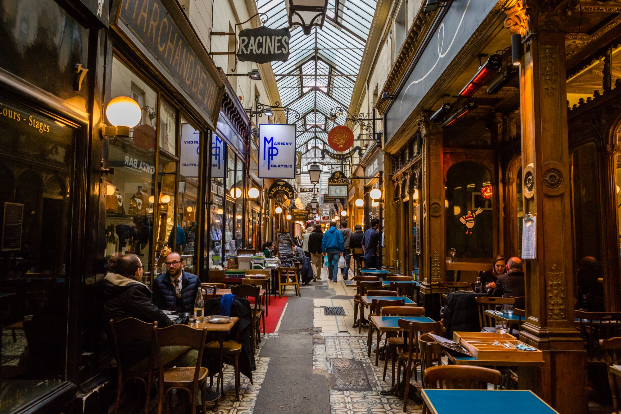 Inside the famous Passage des Panoramas, the oldest covered passageway arcade in Paris, France. The stores are located in the 2nd arrondissement of the city. (Getty)