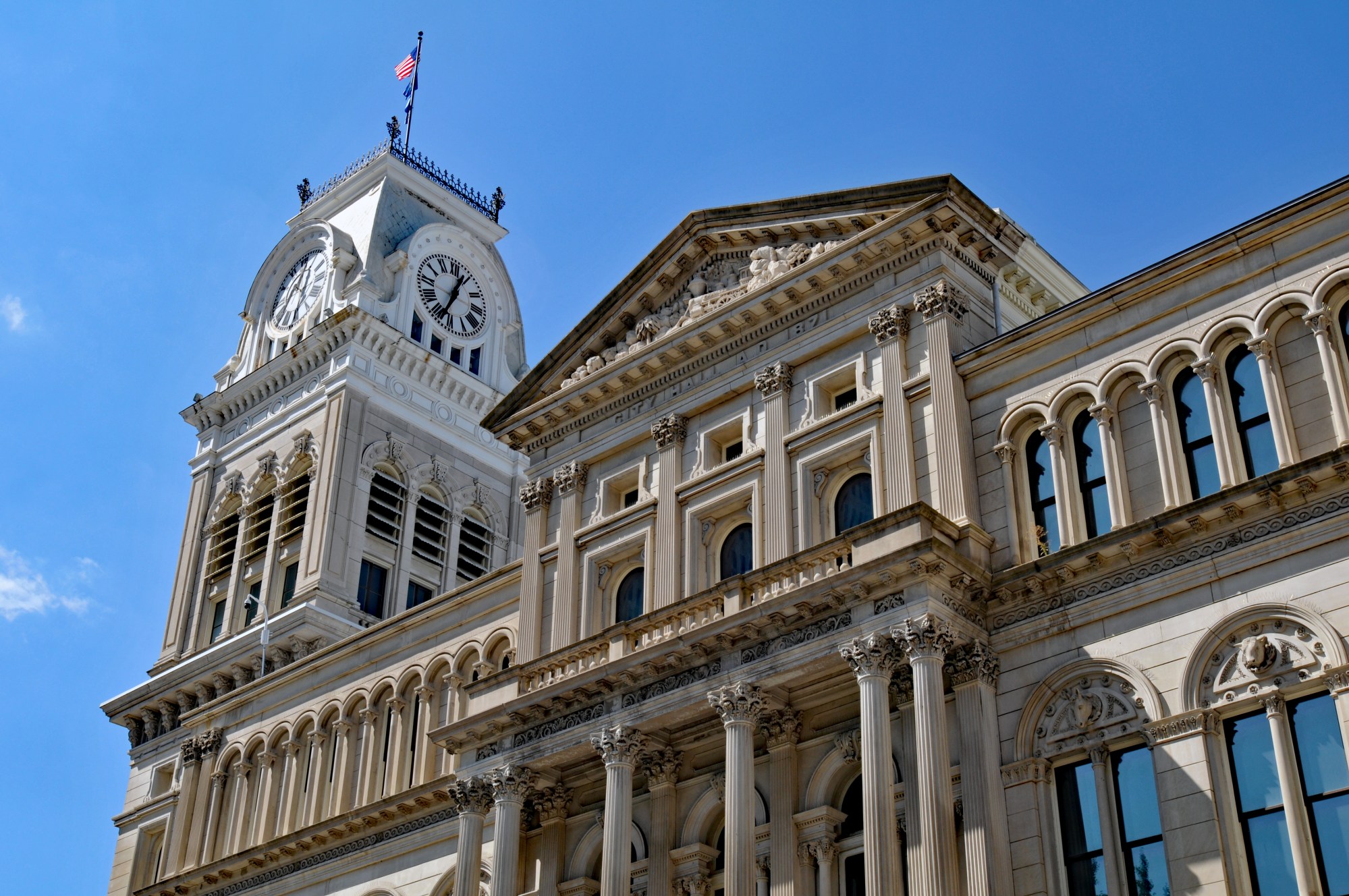 Louisville, KY, USA, Sept. 15, 2023: Louisville's historic city hall, a downtown landmark, opened in 1873 and is now home to the offices and chambers of the Louisville Metro Council.