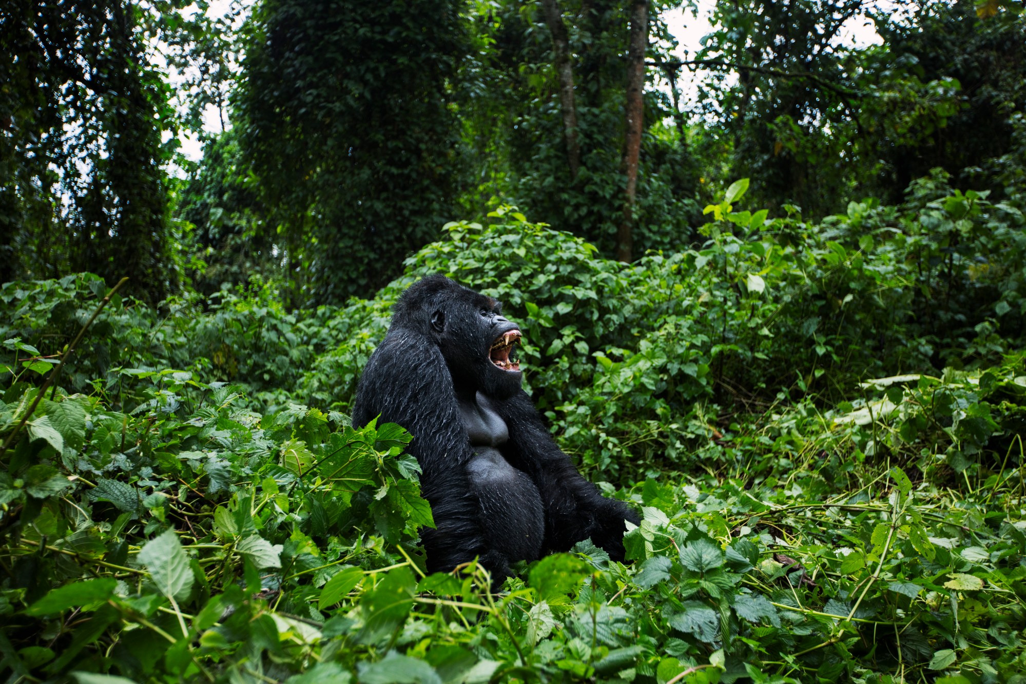Mountain gorilla male 'Silverback' 'Mahindule' yawning - 'Humba' group (Gorilla gorilla beringei). Parc National des Virunga, Democratic Republic of Congo, March 2016. (Getty)