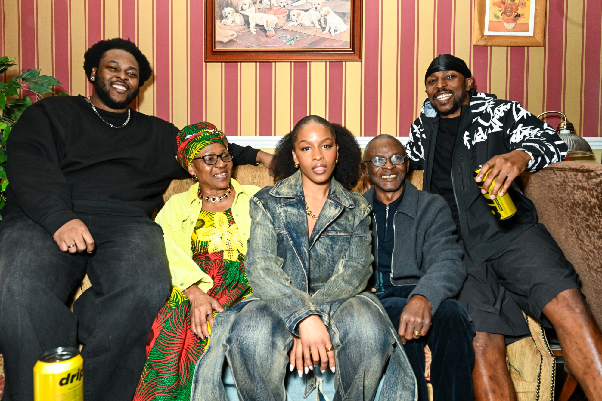 LONDON, ENGLAND - APRIL 01: (L to R) Jason Adenuga, Ify Adanuga, Julie Adenuga, Joe Adanuga and JME aka Jamie Adenuga attend the "Now You Know" launch party at House Party on April 1, 2025 in London, England. (Photo by Dave Benett/Getty Images)