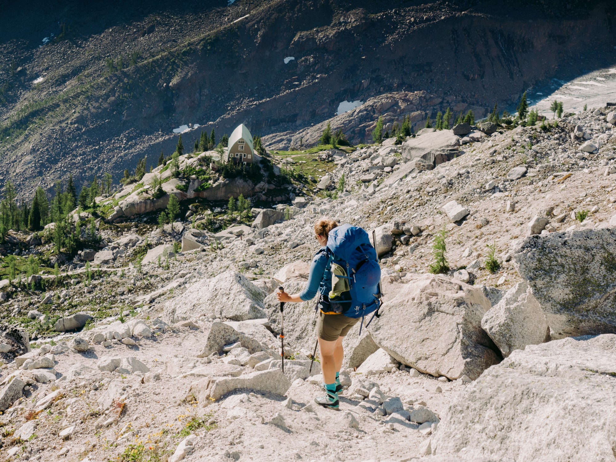 August, 05, 2020 - Golden, BC, CAN: A young adult women hikes down the moraine towards the Alpine Club of Canadas Conrad Kain Hut in Bugaboo Glacier Provincial Park. Getty