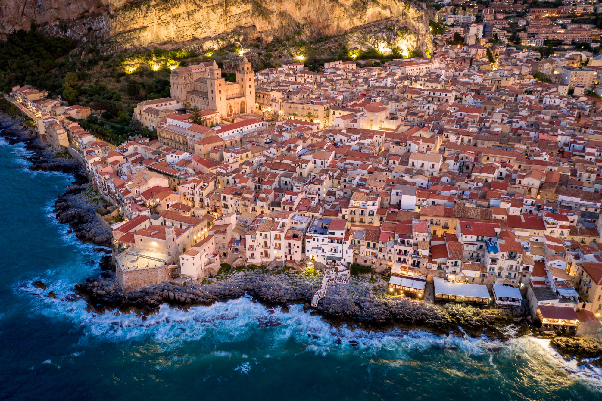 Aerial view of the rocky coast and the houses of Cefalu from the sea in windy and stormy weather. (Getty)