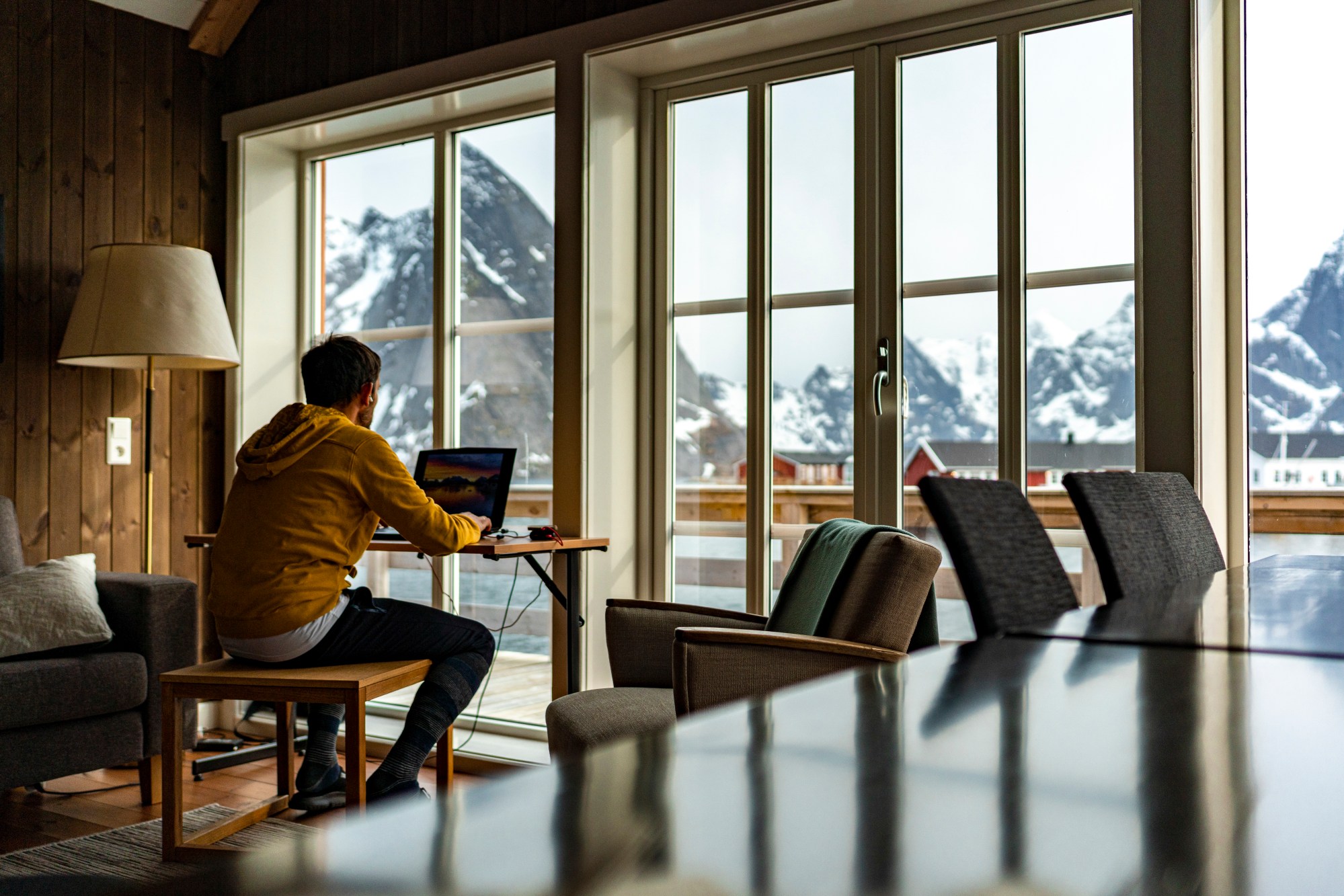 Person looking at mountains and sea from windows of traditional wood house while working with laptop, Lofoten islands, Norway